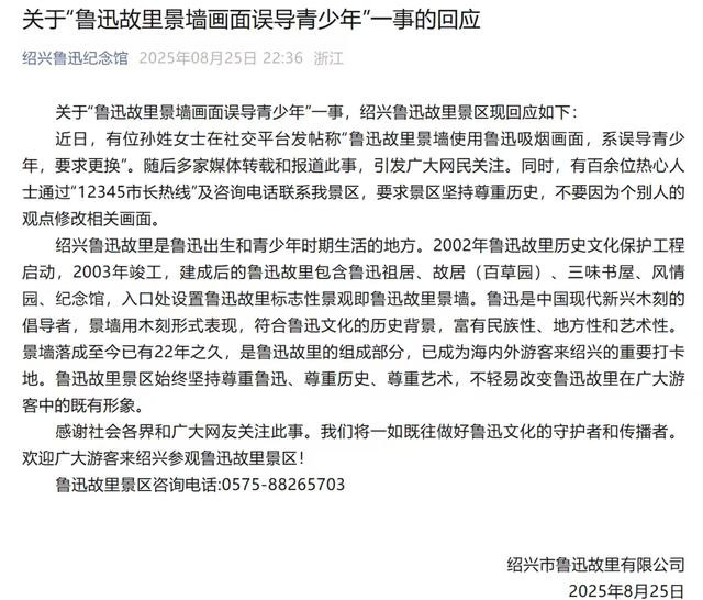 8月25日晚,绍兴鲁迅纪念馆正式回应了该事件,纪念馆表示,“景墙落成至今已有22年之久,是鲁迅故里的组成部分,已成为海内外游客来绍兴的重要打卡地。鲁迅故里景区始终坚持尊重鲁迅、尊重历史、尊重艺术,不轻易改变鲁迅故里在广大游客中的既有形象。”